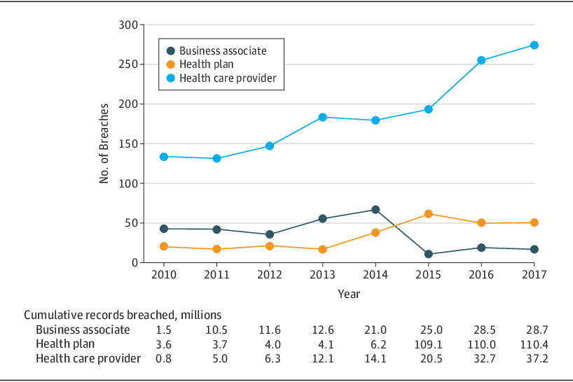 Despite the ethical and legal obligations to protect patient privacy, breach rates have increased. As the type of data breached shifted towards electronic records, the nature of the breaches shifted towards electronic means, such as hacking.