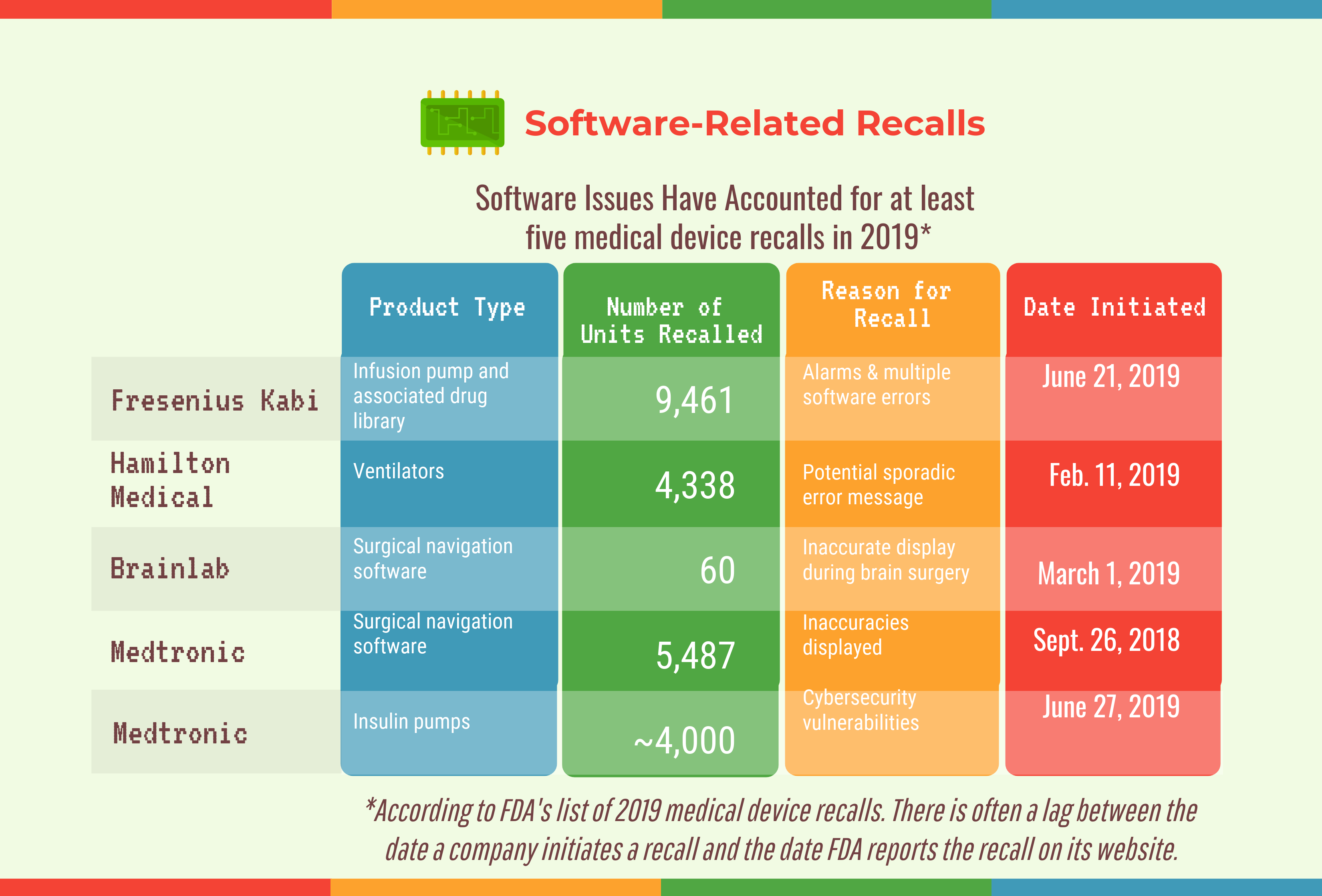 Critics claim that the FDA is too liberal with granting these exceptions and that they are allowing devices with significant technological changes to be fast-tracked in order to cut down on the growing backlog of devices waiting for approval. There are hundreds of millions of devices recalled every year, and analysis shows that devices that went through the quicker 510(k) process were 11.5 times more likely to be subject to recalls than devices that went through the full process. The most common cause for recalls in the last five years was software troubles. Tinkering with the software of a device is oftentimes not enough to move it out of the “substantially equivalent” category so many devices have made it to market without enough software testing thanks to the exception. These issues make software the “weak link” when it comes to the regulation and safety of modern devices.